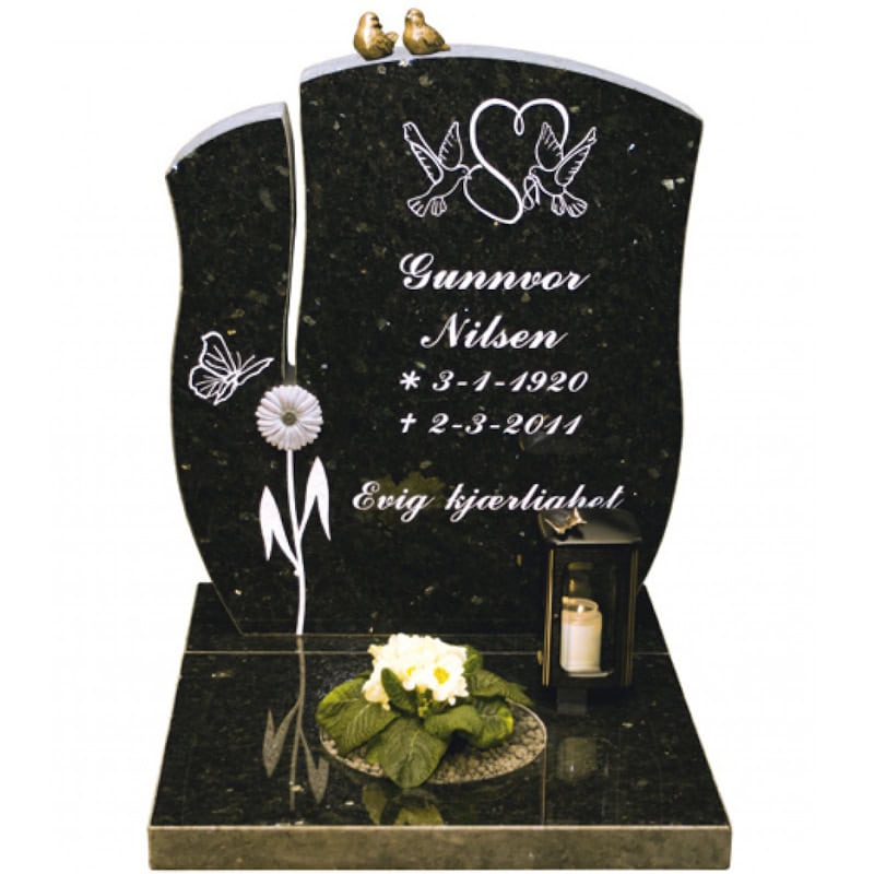Gravstein N5188 i mørk labrador er en gravstein med flott åpning som gir et særpreg. Her vist med lykt montert på bedplate(mod 6), spurver og diverse ornament. Lykt eller annet tilbehør kan bestilles mot et tillegg. Prisen er inkl gravering av standard navn og minneord. For enklere stell kan gravstein montere med bedplate eller bedramme mot et rimelig tillegg i pris.